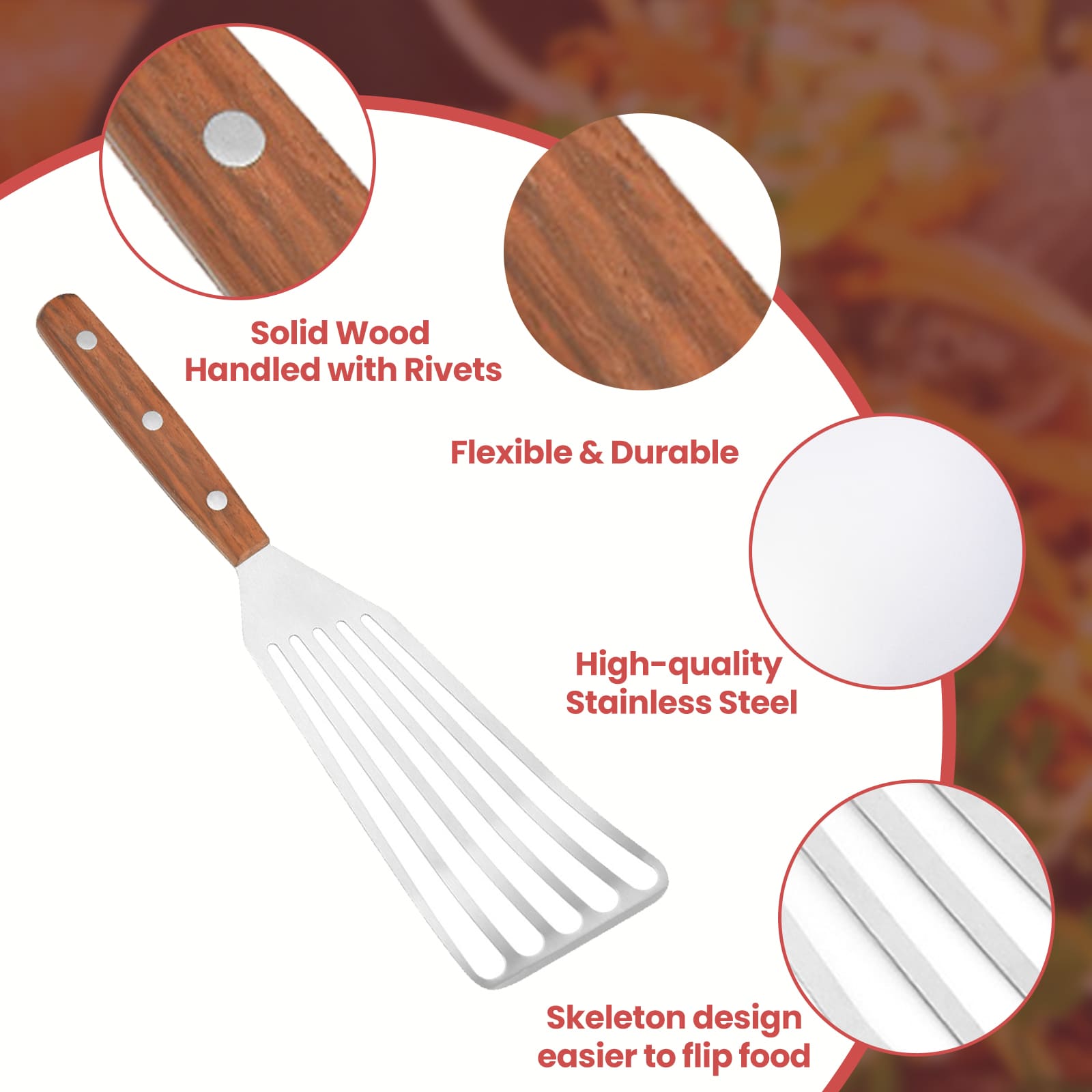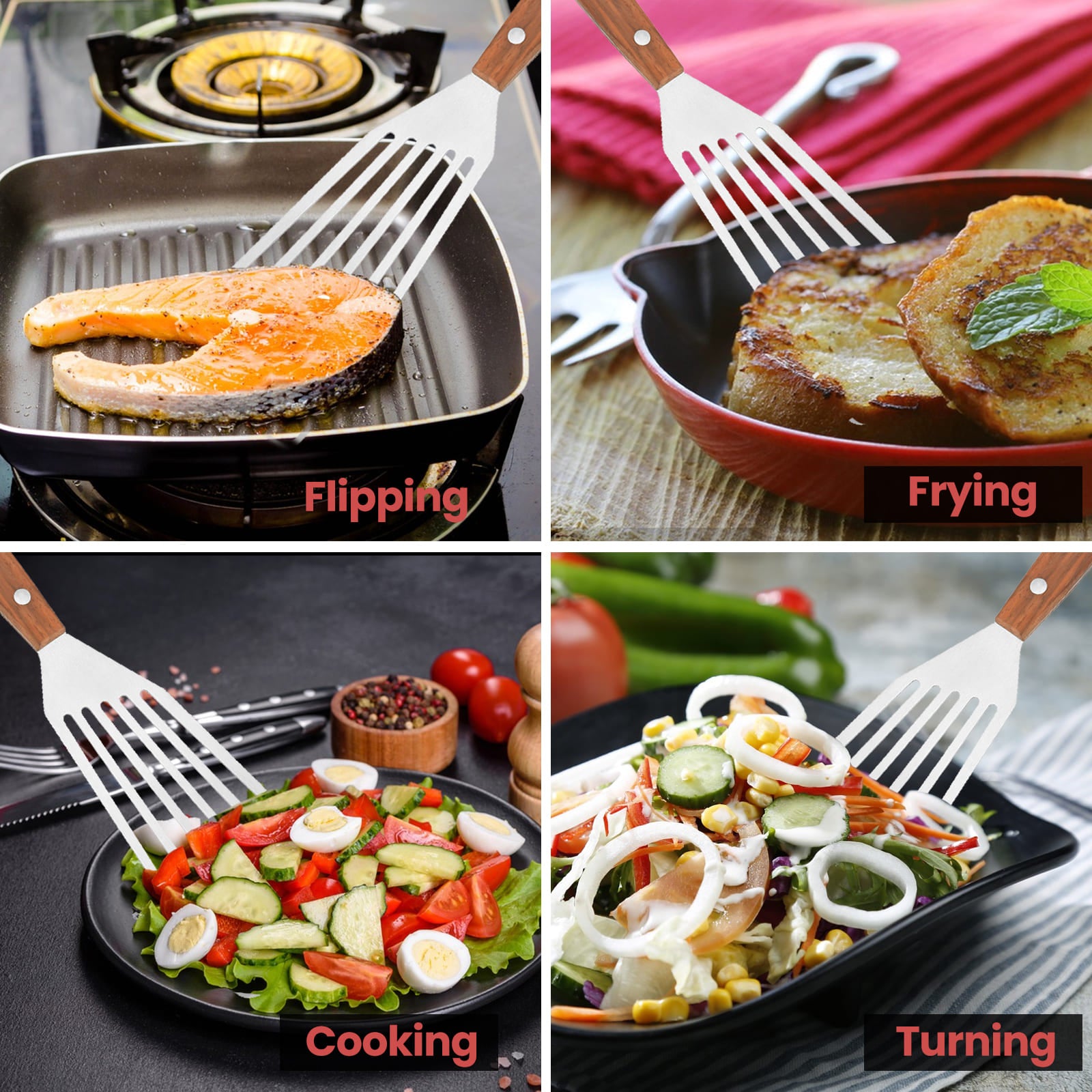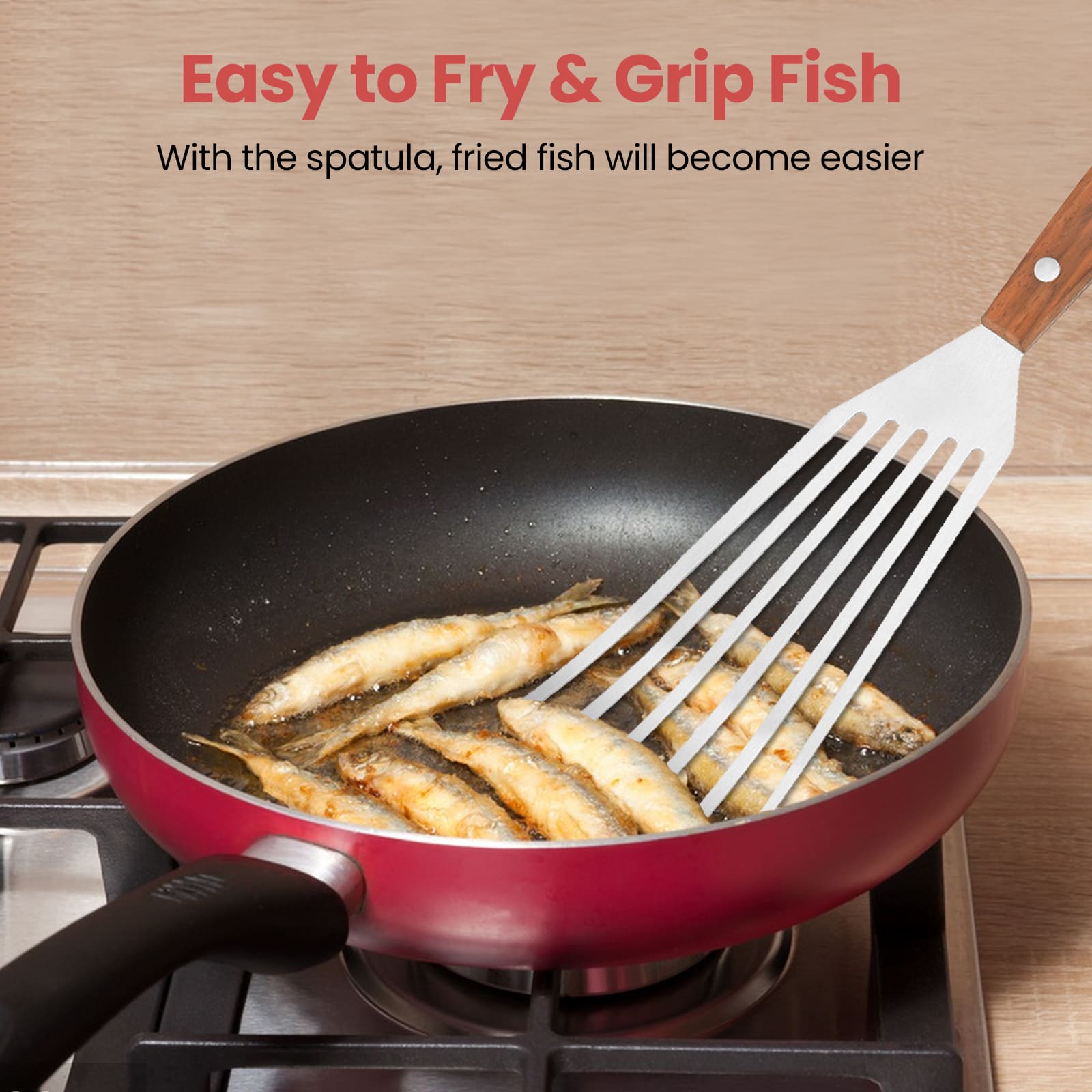 - 【Nonstick and Ergonomic Design】Fish turner spatula with slotted surface will not scratch cookware or food, can also cut food quickly. Wood handle effectively isolates heat and is ergonomic designed for a comfortable grip.