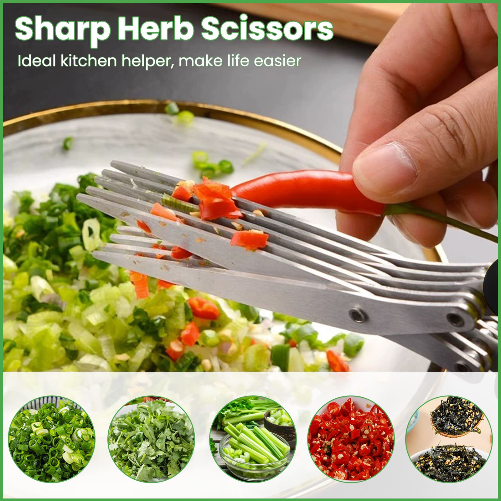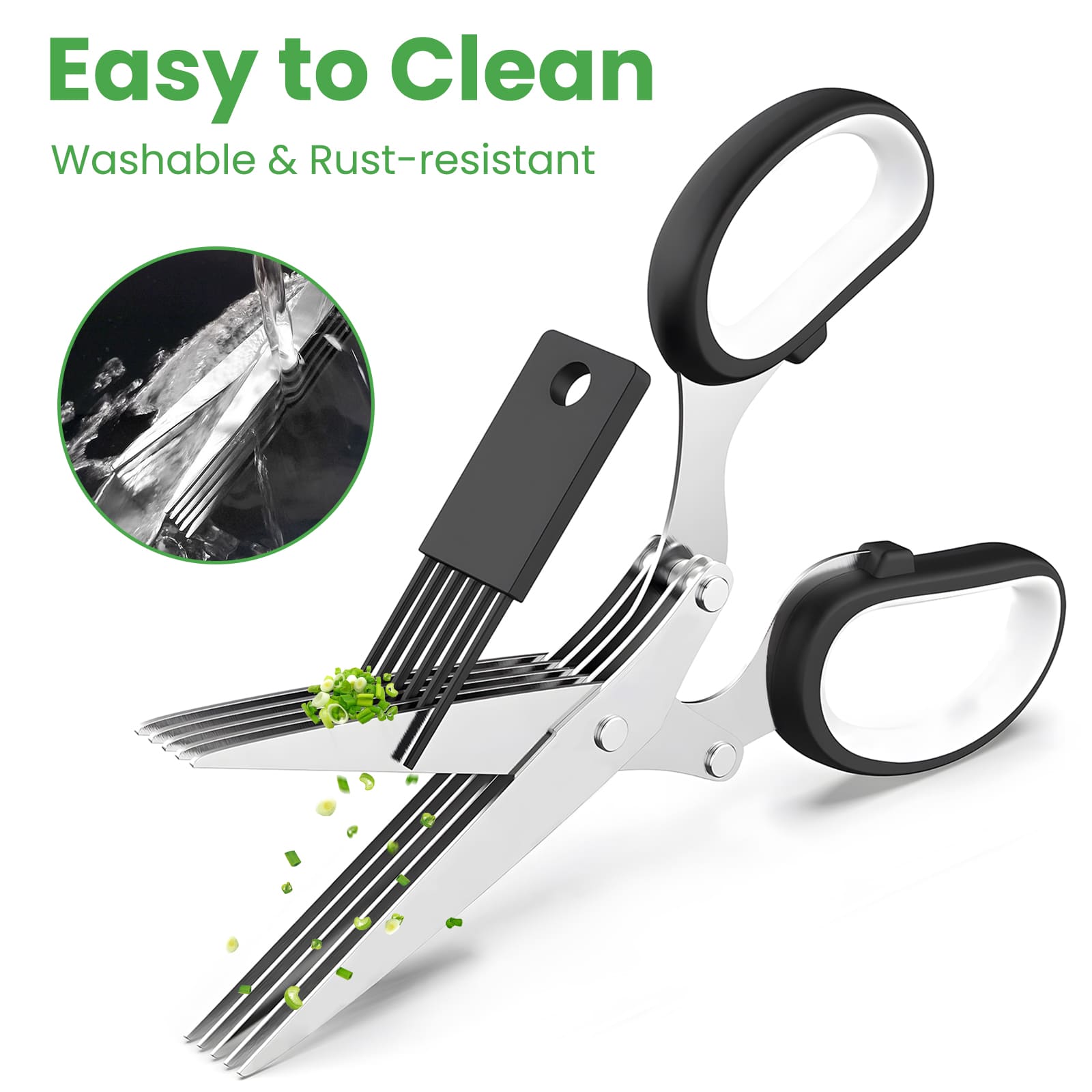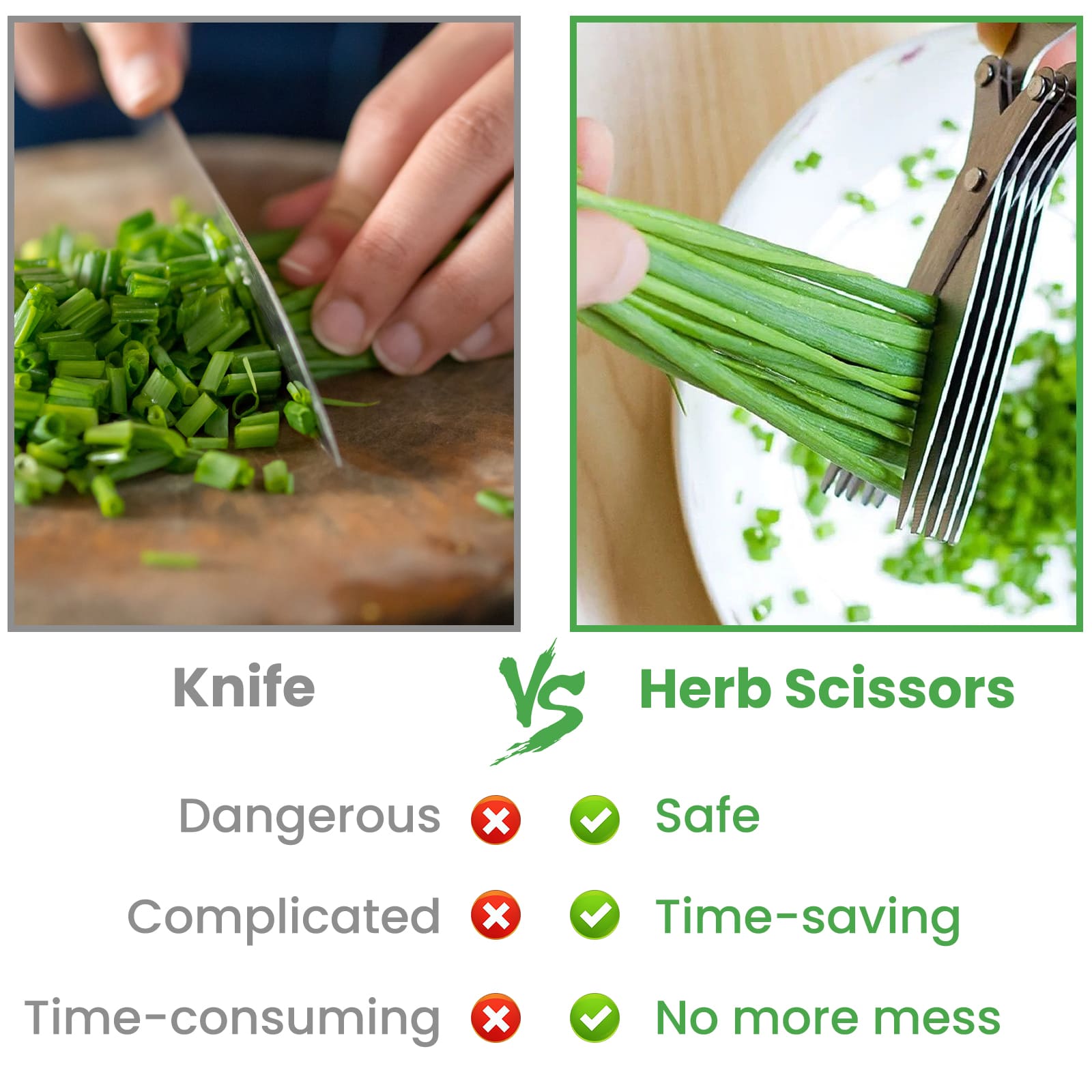- 【5 Blade Herb Scissors】 GEEKHOM Herb Scissors can quickly cut vegetable stems into pieces. Non-slip grip handle with 5 extra-sharp stainless steel blades. These comfortable and super sharp scissors will make food preparation easier and faster. They can also be used for cutting paper.