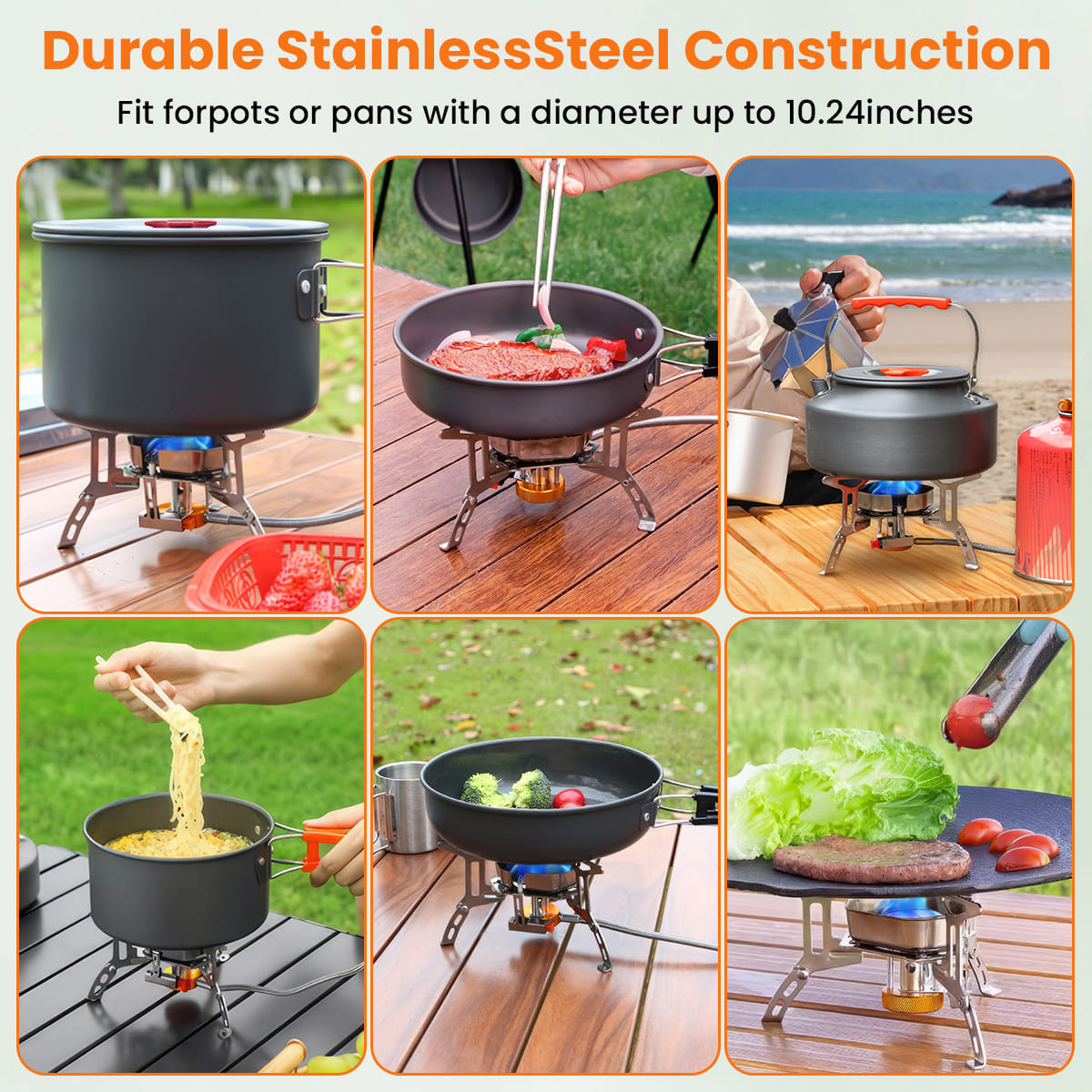 - Windproof Design with Enhanced Stability: Aluminum alloy windshield protects flames from wind interference; Three serrated pot supports prevent slipping; Reinforced legs maintain stability on uneven surfaces
